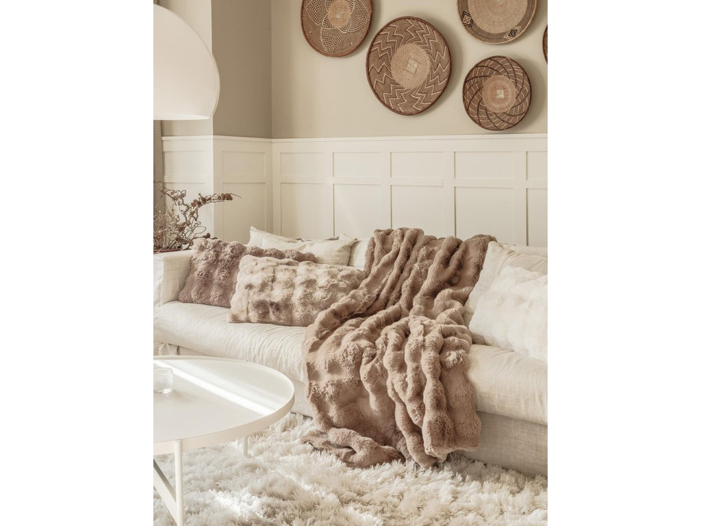 Skapa en varm och inbjudande atmosfär i hemmet med denna lyxiga pläd/överkast i sandfärgat, tonal ull-liknande fuskpälsmaterial. Med generös storlek (140 × 220 cm) passar den perfekt över sängen, soffan eller fåtöljen — både som stilfull inredningsdetalj och som extra värmande filt.